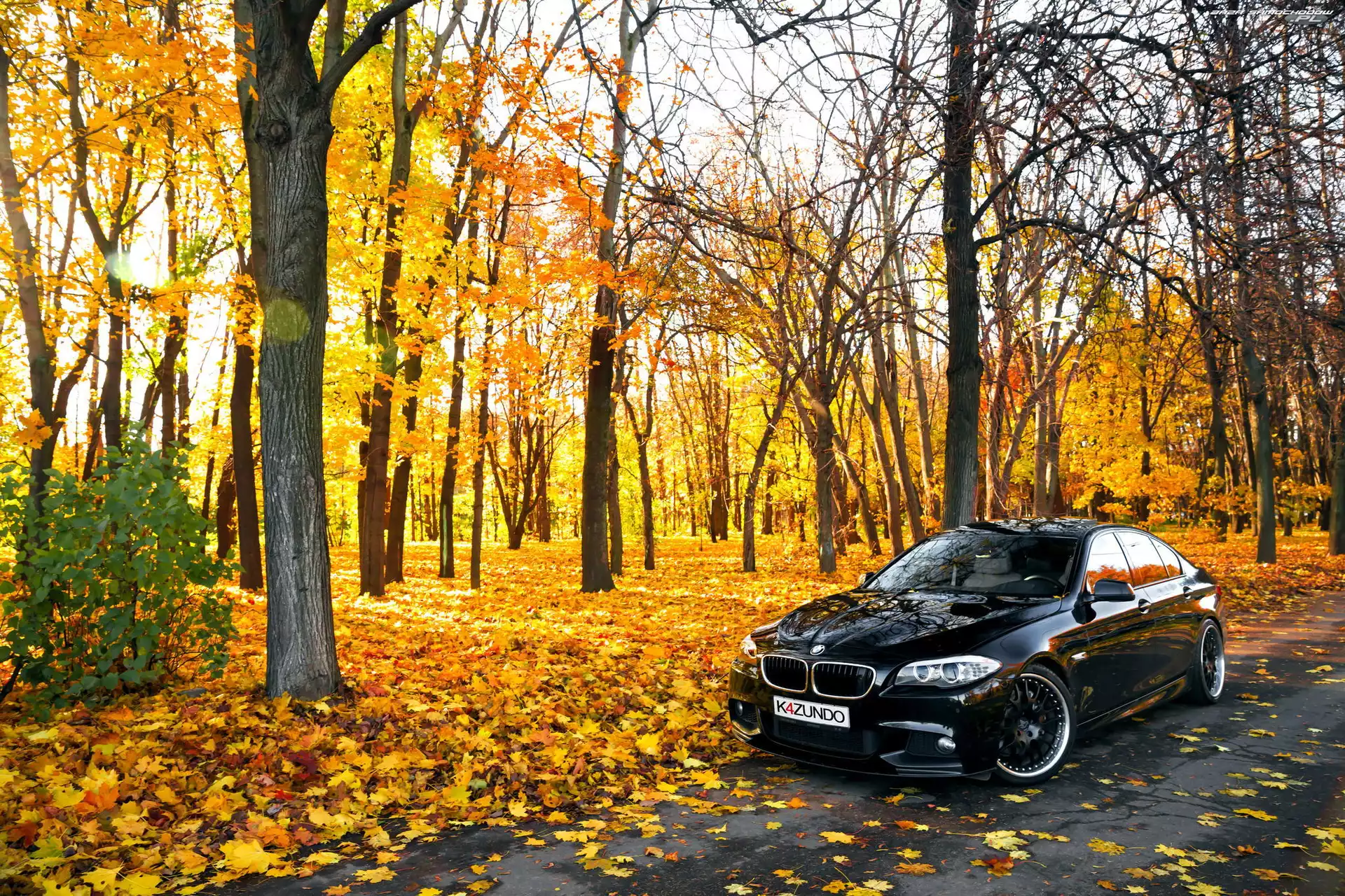 Drzewa, Jesień, Droga, BMW seria 5 F10, Park- Zdjęcia samochodów