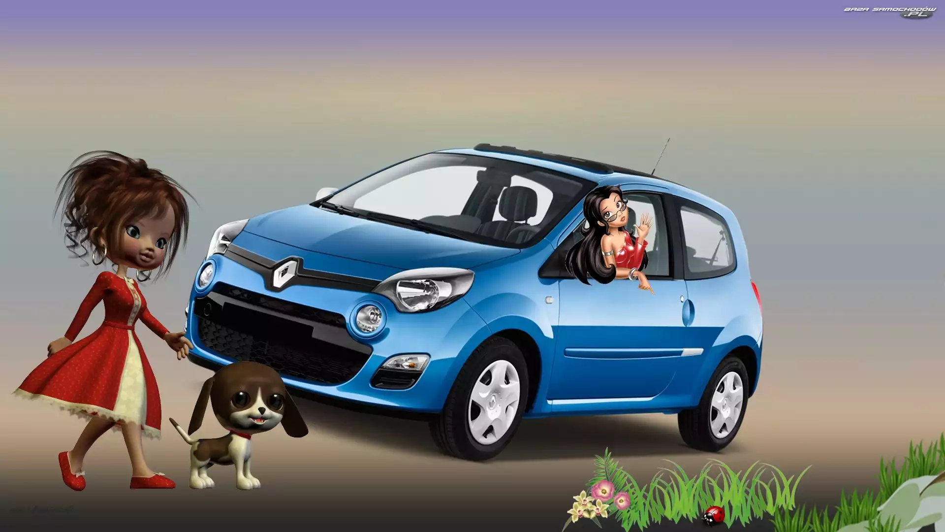 Samochód: Renault, Pies, Samochód, Grafika, Laleczki